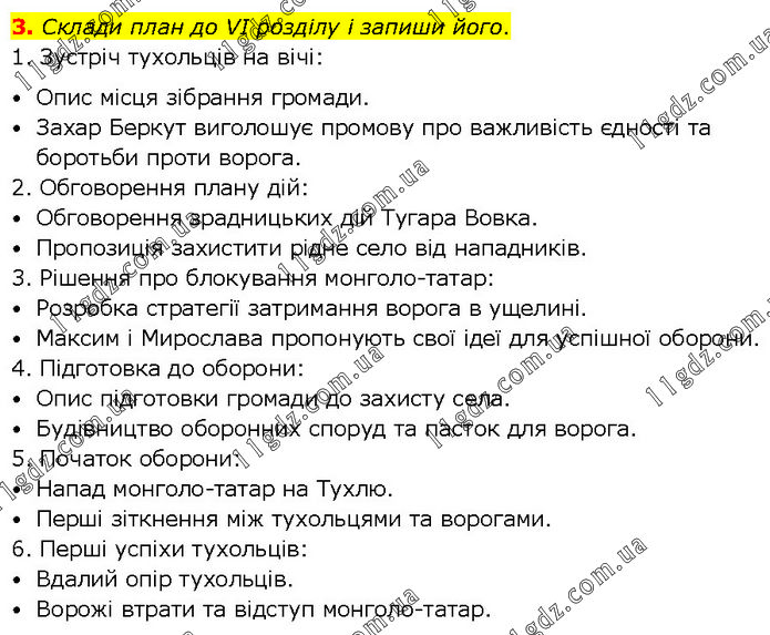 3. Склади план до VI розділу і запиши його. 1. Зустріч тухольців на вічі: • Опис місця зібрання громади. • Захар Беркут виголошує промову про важливість єдності та боротьби проти ворога. 2. Обговорення плану дій: • Обговорення зрадницьких дій Тугара Вовка. • Пропозиція захистити рідне село від нападників. 3. Рішення про блокування монголо-татар: • Розробка стратегії затримання ворога в ущелині. • Максим і Мирослава пропонують свої ідеї для успішної оборони. 4. Підготовка до оборони: • Опис підготовки громади до захисту села. • Будівництво оборонних споруд та пасток для ворога. 5. Початок оборони: • Напад монголо-татар на Тухлю. • Перші зіткнення між тухольцями та ворогами. 6. Перші успіхи тухольців: • Вдалий опір тухольців. • Ворожі втрати та відступ монголо-татар.