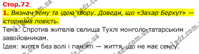 1. Визнач тему та ідею твору. Доведи, що «Захар Беркут» — історична повість. Тема: Спротив жителів селища Тухлі монголо-татарським завойовникам. Ідея: життя без волі і пам'яті — життя, що не має сенсу.