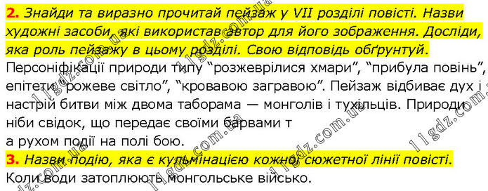 2. Знайди та виразно прочитай пейзаж у VIІ розділі повісті. Назви художні засоби, які використав автор для його зображення. Досліди, яка роль пейзажу в цьому розділі. Свою відповідь обґрунтуй. Персоніфікації природи типу “розжеврілися хмари”, “прибула повінь”, епітети “рожеве світло”, “кровавою загравою”. Пейзаж відбиває дух і настрій битви між двома таборама — монголів і тухільців. Природи ніби свідок, що передає своїми барвами т а рухом події на полі бою. 3. Назви подію, яка є кульмінацією кожної сюжетної лінії повісті. Коли води затоплюють монгольське військо.