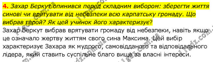 4. Захар Беркут опинився перед складним вибором: зберегти життя синові чи врятувати від небезпеки всю карпатську громаду. Що вибрав герой? Як цей учинок його характеризує? Захар Беркут вибрав врятувати громаду від небезпеки, навіть якщо це означало жертву життям свого сина Максима. Цей вибір характеризує Захара як мудрого, самовідданого та відповідального лідера, який ставить суспільне благо вище за власні інтереси.
