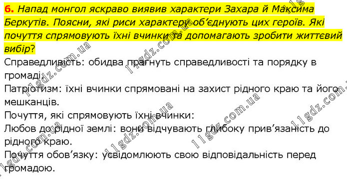 6. Напад монгол яскраво виявив характери Захара й Максима Беркутів. Поясни, які риси характеру об’єднують цих героїв. Які почуття спрямовують їхні вчинки та допомагають зробити життєвий вибір? Справедливість: обидва прагнуть справедливості та порядку в громаді. Патріотизм: їхні вчинки спрямовані на захист рідного краю та його мешканців. Почуття, які спрямовують їхні вчинки: Любов до рідної землі: вони відчувають глибоку прив’язаність до рідного краю. Почуття обов’язку: усвідомлюють свою відповідальність перед громадою.