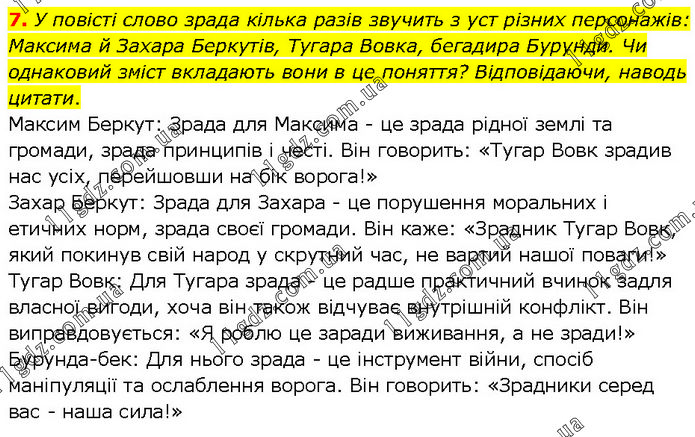 7. У повісті слово зрада кілька разів звучить з уст різних персонажів: Максима й Захара Беркутів, Тугара Вовка, бегадира Бурунди. Чи однаковий зміст вкладають вони в це поняття? Відповідаючи, наводь цитати. Максим Беркут: Зрада для Максима - це зрада рідної землі та громади, зрада принципів і честі. Він говорить: «Тугар Вовк зрадив нас усіх, перейшовши на бік ворога!» Захар Беркут: Зрада для Захара - це порушення моральних і етичних норм, зрада своєї громади. Він каже: «Зрадник Тугар Вовк, який покинув свій народ у скрутний час, не вартий нашої поваги!» Тугар Вовк: Для Тугара зрада - це радше практичний вчинок задля власної вигоди, хоча він також відчуває внутрішній конфлікт. Він виправдовується: «Я роблю це заради виживання, а не зради!» Бурунда-бек: Для нього зрада - це інструмент війни, спосіб маніпуляції та ослаблення ворога. Він говорить: «Зрадники серед вас - наша сила!»