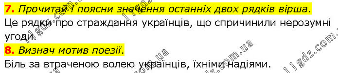 7. Прочитай і поясни значення останніх двох рядків вірша. Це рядки про страждання українців, що спричинили нерозумні угоди. 8. Визнач мотив поезії. Біль за втраченою волею українців, їхніми надіями.