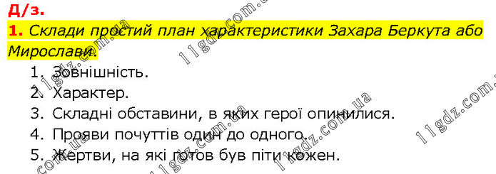 1. Склади простий план характеристики Захара Беркута або Мирослави. 1. Зовнішність. 2. Характер. 3. Складні обставини, в яких герої опинилися. 4. Прояви почуттів один до одного. 5. Жертви, на які готов був піти кожен.