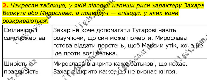 2. Накресли таблицю, у якій ліворуч напиши риси характеру Захара Беркута або Мирослави, а праворуч — епізоди, у яких вони розкриваються. Сміливість і самопожертва Захар не хоче допомагати Тугарові навіть розуміючи, що син може померти. Мирослава готова віддати перстень, щоб Максим утік, хоча це іде проти волі батька. Щирість і правдивість Мирослава відкрито каже батькові, що кохає. Захар відкрито каже, що не визнає князя.