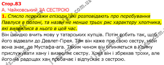 А. Чайковський ЗА СЕСТРОЮ 1. Стисло перекажи епізоди, які розповідають про перебування Павлуся в полоні, та назви не менше трьох рис характеру хлопчика, які виявилися в нього в цей час. Він швидко вчить мову у татарських купців. Потім робить так, щоб його відвезли до Девлет-Гірея. Там він каже про свою сестру, ніби вона знає, де Мустафа-ага. Таким чином він опиняється в Криму прислужувати хану і визволяє сестру. Хоча він і збрехав трохи, але його на радощах хан пробачає і відпускає з сестрою.