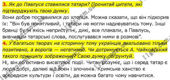 3. Як до Павлуся ставилися татари? Прочитай цитати, які підтверджують твою думку. Вони добре поставилися до хлопця. Можна сказати, що він підкорив їх: “Вiн був понятливий, i татари не могли надивуватись тому. Iншi бранцi були якiсь неприступнi, дикi, все плакали, а Павлусь, вивчивши татарськi слова, послугувався ними в розмовi”. 4. У багатьох творах на історичну тему українців змальовано тільки позитивно, а ворогів — негативно. Чи дотримується А. Чайковський такого принципу зображення? Свою думку обґрунтуй. Ні, він об'єктивно висвітлює події. Читач розуміє, що і серед татар є люди добрі, далекі від воєн і злочинів. Кримське ханство є осередком культури і освіти, де можна багато чому навчитися.