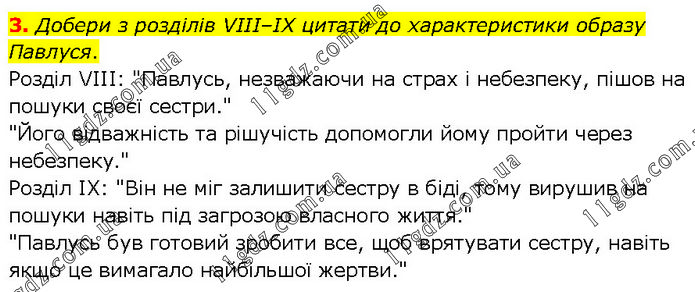 3. Добери з розділів VIІІ–IX цитати до характеристики образу Павлуся. Розділ VIII: "Павлусь, незважаючи на страх і небезпеку, пішов на пошуки своєї сестри." "Його відважність та рішучість допомогли йому пройти через небезпеку." Розділ IX: "Він не міг залишити сестру в біді, тому вирушив на пошуки навіть під загрозою власного життя." "Павлусь був готовий зробити все, щоб врятувати сестру, навіть якщо це вимагало найбільшої жертви."