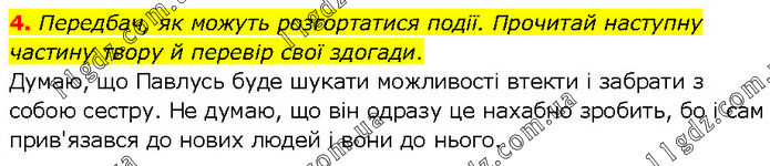 4. Передбач, як можуть розгортатися події. Прочитай наступну частину твору й перевір свої здогади. Думаю, що Павлусь буде шукати можливості втекти і забрати з собою сестру. Не думаю, що він одразу це нахабно зробить, бо і сам прив'язався до нових людей і вони до нього.