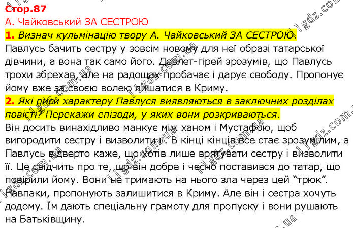 А. Чайковський ЗА СЕСТРОЮ 1. Визнач кульмінацію твору А. Чайковський ЗА СЕСТРОЮ. Павлусь бачить сестру у зовсім новому для неї образі татарської дівчини, а вона так само його. Девлет-гірей зрозумів, що Павлусь трохи збрехав, але на радощах пробачає і дарує свободу. Пропонує йому вже за своєю волею лишатися в Криму. 2. Які риси характеру Павлуся виявляються в заключних розділах повісті? Перекажи епізоди, у яких вони розкриваються. Він досить винахідливо манкує між ханом і Мустафою, щоб вигородити сестру і визволити її. В кінці кінців все стає зрозумілим, а Павлусь відверто каже, що хотів лише врятувати сестру і визволити її. Це свідчить про те, що він добре і чесно поставився до татар, що повірили йому. Вони не тримають на нього зла через цей “трюк”. Навпаки, пропонують залишитися в Криму. Але він і сестра хочуть додому. Їм дають спеціальну грамоту для пропуску і вони рушають на Батьківщину.