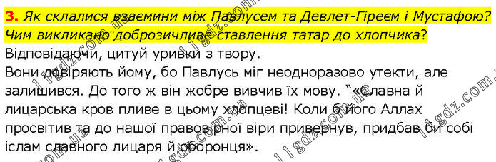 3. Як склалися взаємини між Павлусем та Девлет-Гiреєм і Мустафою? Чим викликано доброзичливе ставлення татар до хлопчика? Відповідаючи, цитуй уривки з твору. Вони довіряють йому, бо Павлусь міг неодноразово утекти, але залишився. До того ж він жобре вивчив їх мову. “«Славна й лицарська кров пливе в цьому хлопцевi! Коли б його Аллах просвiтив та до нашої правовiрної вiри привернув, придбав би собі iслам славного лицаря й оборонця».