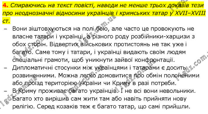 4. Спираючись на текст повісті, наведи не менше трьох доказів тези про неоднозначні відносини українців і кримських татар у XVII–XVIII ст. – Вони зіштовхуються на полі бою, але часто це провокують не власне татари і українці, а різного роду розбійники-харцизи з обох сторін. Відвертих військових протистоянь не так уже і багато. Саме тому і татари, і українці видають своїм людям спеціальні грамоти, щоб уникнути зайвої конфронтації. – Дипломатичні стосунки між українцями і татарами є досить розвиненними. Можна легко домовитися про обмін полоненими або проїзд територією України чи Криму в разі потреби. – В Криму проживає багато українців. І не всі вони невольники. Багато хто вирішив сам жити там або навіть прийняти нову релігію. Серед козаків теж є багато татар, що самі прийшли.