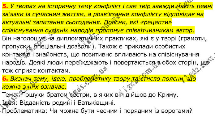 5. У творах на історичну тему конфлікт і сам твір завжди мають певні зв’язки із сучасним життям, а розв’язання конфлікту відповідає на актуальні запитання сьогодення. Поясни, які «рецепти» співіснування сусідніх народів пропонує співвітчизникам автор. Він наголошує на дипломатичних практиках, які є у творі (грамоти, пропуски, спеціальні дозволи). Також є приклади особистих контактів і знайомств, що позитивно впливають на співіснування народів. Деякі люди переїжджають і повертаються з обох сторін, що теж сприяє контактам. 6. Визнач тему, ідею, проблематику твору та стисло поясни, що кожна з них означає. Тема: Пошуки братом сестри, в яких він дійшов до Криму. Ідея: Відданість родині і Батьківщині. Проблематика: Чи можна бути чесним і порядним із ворогами?