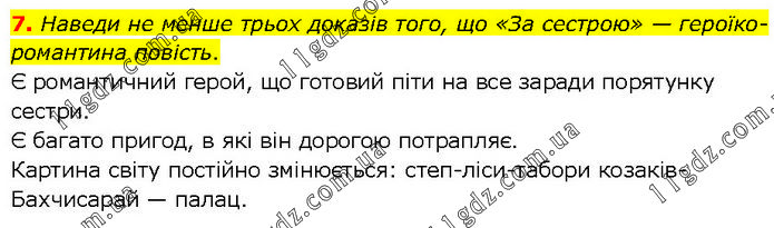 7. Наведи не менше трьох доказів того, що «За сестрою» — героїко-романтина повість. Є романтичний герой, що готовий піти на все заради порятунку сестри. Є багато пригод, в які він дорогою потрапляє. Картина світу постійно змінюється: степ-ліси-табори козаків-Бахчисарай — палац.