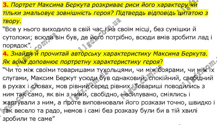 3. Портрет Максима Беркута розкриває риси його характеру чи тільки змальовує зовнішність героя? Підтвердь відповідь цитатою з твору. “Все у нього виходило в свій час і на своїм місці, без сумішки й сутолоки; всюди він був, де його потрібно, всюди вмів зробити лад і порядок”. 4. Знайди й прочитай авторську характеристику Максима Беркута. Як вона доповнює портретну характеристику героя? “Чи то між своїми товаришами тухольцями, чи між боярами, чи між їх слугами, Максим Беркут усюди був однаковий, спокійний, свобідний в рухах і словах, мов рівний серед рівних. Товариші поводились з ним так само, як він з ними, свобідно, несилувано, сміялись і жартували з ним, а проте виповнювали його розкази точно, швидко і так весело та радо, немов і самі без розказу були би в тій хвилі зробили те саме”
