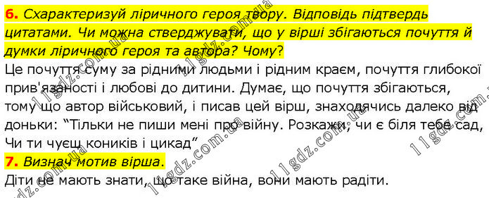 6. Схарактеризуй ліричного героя твору. Відповідь підтвердь цитатами. Чи можна стверджувати, що у вірші збігаються почуття й думки ліричного героя та автора? Чому? Це почуття суму за рідними людьми і рідним краєм, почуття глибокої прив'язаності і любові до дитини. Думає, що почуття збігаються, тому що автор військовий, і писав цей вірш, знаходячись далеко від доньки: “Тільки не пиши мені про війну. Розкажи, чи є біля тебе сад, Чи ти чуєш коників і цикад” 7. Визнач мотив вірша. Діти не мають знати, що таке війна, вони мають радіти.