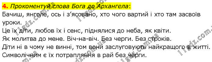 4. Прокоментуй слова Бога до Архангела: Бачиш, янголе, ось і з’ясовано, хто чого вартий і хто там засвоїв уроки. Це їх діти, любов їх і сенс, піднялися до неба, як квіти. Як молитва до мене. Віч-на-віч. Без черги. Без строків. Діти ні в чому не винні, том вони заслуговують найкращого в житті. Символічним є їх потрапляння в рай без черги.