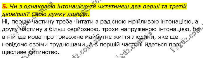5. Чи з однаковою інтонацією ти читатимеш два перші та третій двовірші? Свою думку доведи. Ні, першу частину треба читати з радісною мрійливою інтонацією, а другу частину з більш серйозною, трохи напруженою інтонацією, бо в ній іде мова про тривожне майбутнє життя людини, яке ще невідомо своїми труднощами. А в першій частині йдеться про щасливе дитинство.