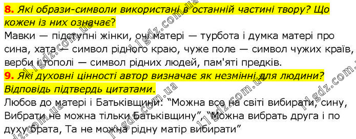 8. Які образи-символи використані в останній частині твору? Що кожен із них означає? Мавки — підступні жінки, очі матері — турбота і думка матері про сина, хата — символ рідного краю, чуже поле — символ чужих країв, верби і тополі — символ рідних людей, пам'яті предків. 9. Які духовні цінності автор визначає як незмінні для людини? Відповідь підтвердь цитатами. Любов до матері і Батьківщини: “Можна все на світі вибирати, сину, Вибрати не можна тільки Батьківщину”, “Можна вибрать друга і по духу брата, Та не можна рідну матір вибирати”