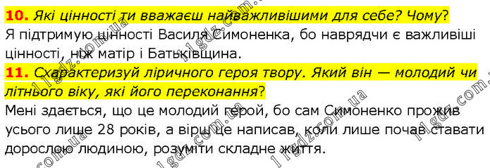 10. Які цінності ти вважаєш найважливішими для себе? Чому? Я підтримую цінності Василя Симоненка, бо наврядчи є важливіші цінності, ніж матір і Батьківщина. 11. Схарактеризуй ліричного героя твору. Який він — молодий чи літнього віку, які його переконання? Мені здається, що це молодий герой, бо сам Симоненко прожив усього лише 28 років, а вірш це написав, коли лише почав ставати дорослою людиною, розуміти складне життя.