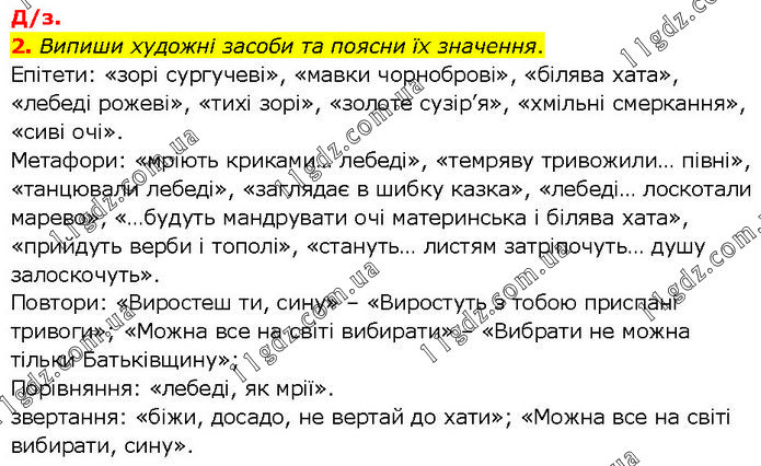 2. Випиши художні засоби та поясни їх значення. Епітети: «зорі сургучеві», «мавки чорноброві», «білява хата», «лебеді рожеві», «тихі зорі», «золоте сузір’я», «хмільні смеркання», «сиві очі». Метафори: «мріють криками… лебеді», «темряву тривожили… півні», «танцювали лебеді», «заглядає в шибку казка», «лебеді… лоскотали марево», «…будуть мандрувати очі материнська і білява хата», «прийдуть верби і тополі», «стануть… листям затріпочуть… душу залоскочуть». Повтори: «Виростеш ти, сину» – «Виростуть з тобою приспані тривоги»; «Можна все на світі вибирати» – «Вибрати не можна тільки Батьківщину»; Порівняння: «лебеді, як мрії». звертання: «біжи, досадо, не вертай до хати»; «Можна все на світі вибирати, сину».