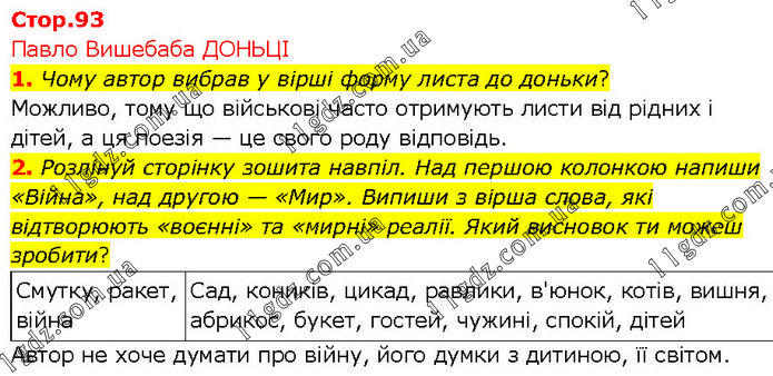 Павло Вишебаба ДОНЬЦІ 1. Чому автор вибрав у вірші форму листа до доньки? Можливо, тому що військові часто отримують листи від рідних і дітей, а ця поезія — це свого роду відповідь. 2. Розлінуй сторінку зошита навпіл. Над першою колонкою напиши «Війна», над другою — «Мир». Випиши з вірша слова, які відтворюють «воєнні» та «мирні» реалії. Який висновок ти можеш зробити? Смутку, ракет, війна Сад, коників, цикад, равлики, в'юнок, котів, вишня, абрикос, букет, гостей, чужині, спокій, дітей Автор не хоче думати про війну, його думки з дитиною, її світом.
