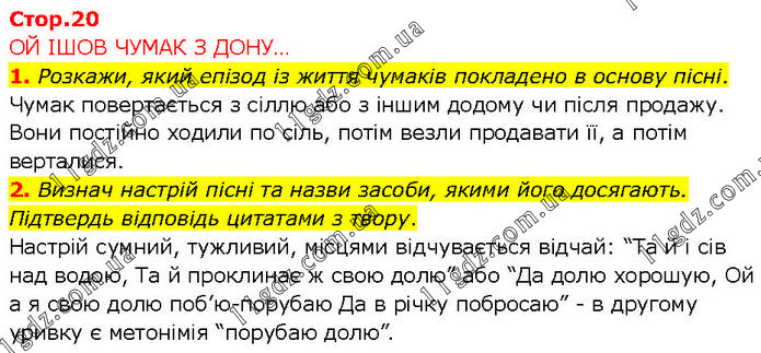 ОЙ ІШОВ ЧУМАК З ДОНУ… 1. Розкажи, який епізод із життя чумаків покладено в основу пісні. Чумак повертається з сіллю або з іншим додому чи після продажу. Вони постійно ходили по сіль, потім везли продавати її, а потім верталися. 2. Визнач настрій пісні та назви засоби, якими його досягають. Підтвердь відповідь цитатами з твору. Настрій сумний, тужливий, місцями відчувається відчай: “Та й і сів над водою, Та й проклинає ж свою долю” або “Да долю хорошую, Ой а я свою долю поб’ю-порубаю Да в річку побросаю” - в другому уривку є метонімія “порубаю долю”.