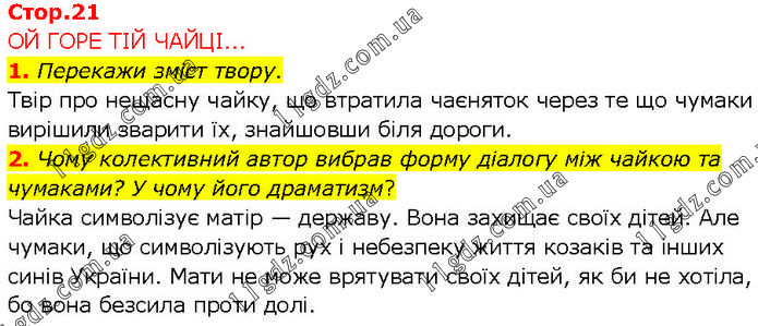 ОЙ ГОРЕ ТІЙ ЧАЙЦІ... 1. Перекажи зміст твору. Твір про нещасну чайку, що втратила чаєняток через те що чумаки вирішили зварити їх, знайшовши біля дороги. 2. Чому колективний автор вибрав форму діалогу між чайкою та чумаками? У чому його драматизм? Чайка символізує матір — державу. Вона захищає своїх дітей. Але чумаки, що символізують рух і небезпеку життя козаків та інших синів України. Мати не може врятувати своїх дітей, як би не хотіла, бо вона безсила проти долі.