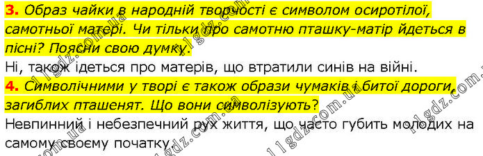 3. Образ чайки в народній творчості є символом осиротілої, самотньої матері. Чи тільки про самотню пташку-матір йдеться в пісні? Поясни свою думку. Ні, також ідеться про матерів, що втратили синів на війні. 4. Символічними у творі є також образи чумаків і битої дороги, загиблих пташенят. Що вони символізують? Невпинний і небезпечний рух життя, що часто губить молодих на самому своєму початку.
