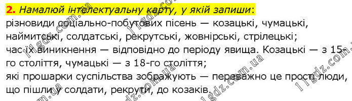 Намалюй інтелектуальну карту, у якій запиши: різновиди соціально-побутових пісень — козацькі, чумацькі, наймитські, солдатські, рекрутські, жовнірські, стрілецькі; час їх виникнення — відповідно до періоду явища. Козацькі — з 15-го століття, чумацькі — з 18-го століття; які прошарки суспільства зображують — переважно це прості люди, що пішли у солдати, рекрути, до козаків.