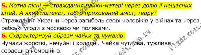 5. Мотив пісні — страждання чайки-матері через долю її нещасних дітей. А який підтекст, тобто прихований зміст, твору? Страждання України через загибель своїх чоловіків у війнах та через рабські угоди з москвою чи поляками. 6. Схарактеризуй образи чайки та чумаків. Чумаки жорсткі, нечуйні і холодні. Чайка чутлива, тужлива, сердешна і емоційна.