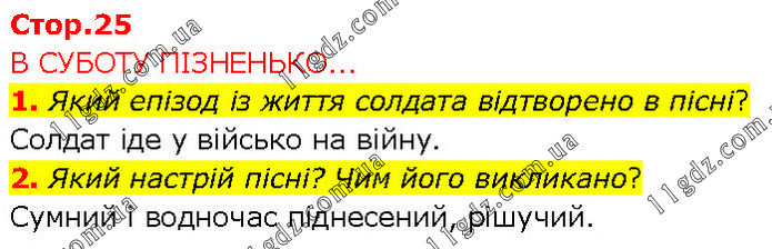 В СУБОТУ ПІЗНЕНЬКО... 1. Який епізод із життя солдата відтворено в пісні? Солдат іде у військо на війну. 2. Який настрій пісні? Чим його викликано? Сумний і водночас піднесений, рішучий.