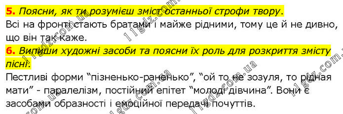 5. Поясни, як ти розумієш зміст останньої строфи твору. Всі на фронті стають братами і майже рідними, тому це й не дивно, що він так каже. 6. Випиши художні засоби та поясни їх роль для розкриття змісту пісні. Пестливі форми “пізненько-раненько”, “ой то не зозуля, то рідная мати” - паралелізм, постійний епітет “молоді дівчина”. Вони є засобами образності і емоційної передачі почуттів.