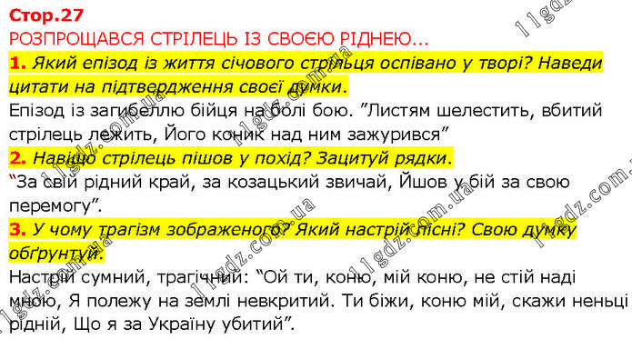 РОЗПРОЩАВСЯ СТРІЛЕЦЬ ІЗ СВОЄЮ РІДНЕЮ... 1. Який епізод із життя січового стрільця оспівано у творі? Наведи цитати на підтвердження своєї думки. Епізод із загибеллю бійця на болі бою. ”Листям шелестить, вбитий стрілець лежить, Його коник над ним зажурився” 2. Навіщо стрілець пішов у похід? Зацитуй рядки. “За свій рідний край, за козацький звичай, Йшов у бій за свою перемогу”. 3. У чому трагізм зображеного? Який настрій пісні? Свою думку обґрунтуй. Настрій сумний, трагічний: “Ой ти, коню, мій коню, не стій наді мною, Я полежу на землі невкритий. Ти біжи, коню мій, скажи неньці рідній, Що я за Україну убитий”.