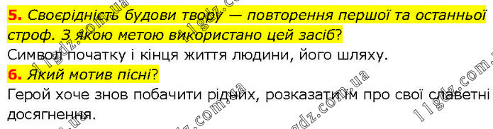 5. Своєрідність будови твору — повторення першої та останньої строф. З якою метою використано цей засіб? Символ початку і кінця життя людини, його шляху. 6. Який мотив пісні? Герой хоче знов побачити рідних, розказати їм про свої славетні досягнення.