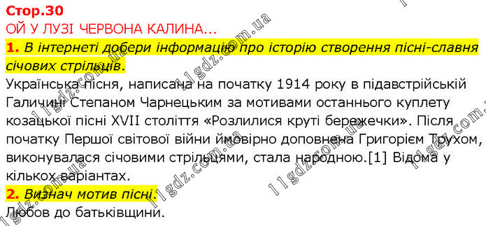 ОЙ У ЛУЗІ ЧЕРВОНА КАЛИНА... 1. В інтернеті добери інформацію про історію створення пісні-славня січових стрільців. Українська пісня, написана на початку 1914 року в підавстрійській Галичині Степаном Чарнецьким за мотивами останнього куплету козацької пісні XVII століття «Розлилися круті бережечки». Після початку Першої світової війни ймовірно доповнена Григорієм Трухом, виконувалася січовими стрільцями, стала народною.[1] Відома у кількох варіантах. 2. Визнач мотив пісні. Любов до батьківщини.