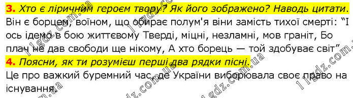 3. Хто є ліричним героєм твору? Як його зображено? Наводь цитати. Він є борцем, воїном, що обирає полум'я віни замість тихої смерті: “І ось ідемо в бою життєвому Тверді, міцні, незламні, мов граніт, Бо плач не дав свободи ще нікому, А хто борець — той здобуває світ” 4. Поясни, як ти розумієш перші два рядки пісні. Це про важкий буремний час, де України виборювала своє право на існування.