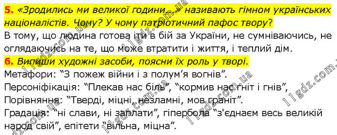5. «Зродились ми великої години...» називають гімном українських націоналістів. Чому? У чому патріотичний пафос твору? В тому, що людина готова іти в бій за України, не сумніваючись, не оглядаючись на те, що може втратити і життя, і теплий дім. 6. Випиши художні засоби, поясни їх роль у творі. Метафори: “З пожеж війни і з полум’я вогнів”. Персоніфікація: “Плекав нас біль”, “кормив нас гніт і гнів”, Порівняння: “Тверді, міцні, незламні, мов граніт”. Градація: “ні слави, ні заплати”, гіпербола “з'єднаєм весь великій народ свій”, епітети “вільна, міцна”.