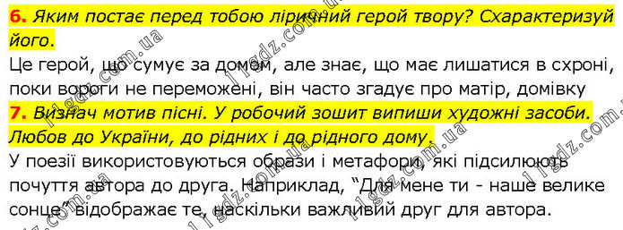 6. Яким постає перед тобою ліричний герой твору? Схарактеризуй його. Це герой, що сумує за домом, але знає, що має лишатися в схроні, поки вороги не переможені, він часто згадує про матір, домівку 7. Визнач мотив пісні. У робочий зошит випиши художні засоби. Любов до України, до рідних і до рідного дому. У поезії використовуються образи і метафори, які підсилюють почуття автора до друга. Наприклад, “Для мене ти - наше велике сонце” відображає те, наскільки важливий друг для автора.