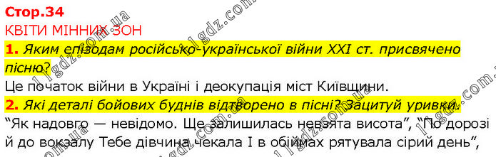 КВІТИ МІННИХ ЗОН 1. Яким епізодам російсько-української війни ХХІ ст. присвячено пісню? Це початок війни в Україні і деокупація міст Київщини. 2. Які деталі бойових буднів відтворено в пісні? Зацитуй уривки. “Як надовго — невідомо. Ще залишилась невзята висота”, “По дорозі й до вокзалу Тебе дівчина чекала І в обіймах рятувала сірий день”,