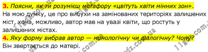 3. Поясни, як ти розумієш метафору «цвітуть квіти мінних зон». На мою думку, це про вибухи на замінованих територіях залишених міст, хоча, можливо, автор мав на увазі квіти, що ростуть у залишених містах. 4. Яку форму вибрав автор — монологічну чи діалогічну? Чому? Він звертається до матері.