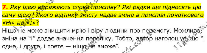 Яку ідею виражають слова приспіву? Які рядки ще підносять цю саму ідею? Якого відтінку змісту надає зміна в приспіві початкового «Ні» на «І»? Ніщо не може знищити мрію і віру людини про перемогу. Можливо, зміна на “і” додає значення переліку. Тобто, автор наголошує, що “і одне, і друге, і третє — ніщо не зможе”.