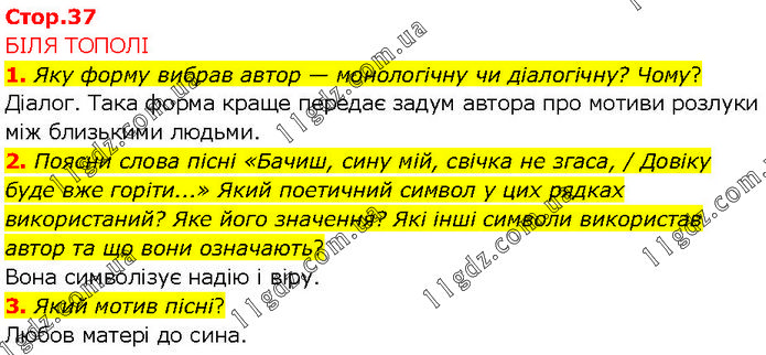 БІЛЯ ТОПОЛІ 1. Яку форму вибрав автор — монологічну чи діалогічну? Чому? Діалог. Така форма краще передає задум автора про мотиви розлуки між близькими людьми. 2. Поясни слова пісні «Бачиш, сину мій, свічка не згаса, / Довіку буде вже горіти...» Який поетичний символ у цих рядках використаний? Яке його значення? Які інші символи використав автор та що вони означають? Вона символізує надію і віру. 3. Який мотив пісні? Любов матері до сина.