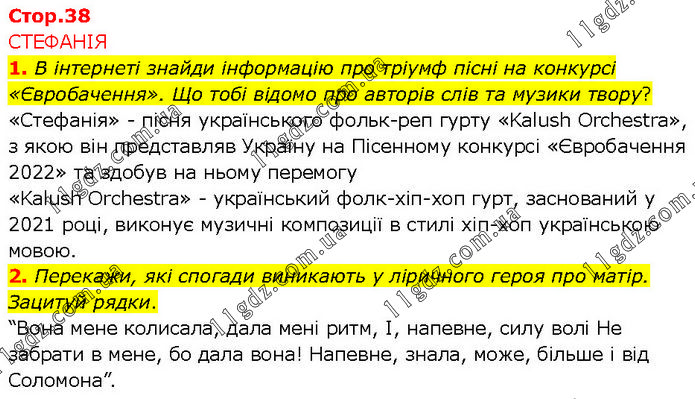 СТЕФАНІЯ 1. В інтернеті знайди інформацію про тріумф пісні на конкурсі «Євробачення». Що тобі відомо про авторів слів та музики твору? «Стефанія» - пісня українського фольк-реп гурту «Kalush Orchestra», з якою він представляв Україну на Пісенному конкурсі «Євробачення 2022» та здобув на ньому перемогу «Kalush Orchestra» - український фолк-хіп-хоп гурт, заснований у 2021 році, виконує музичні композиції в стилі хіп-хоп українською мовою. 2. Перекажи, які спогади виникають у ліричного героя про матір. Зацитуй рядки. “Вона мене колисала, дала мені ритм, І, напевне, силу волі Не забрати в мене, бо дала вона! Напевне, знала, може, більше і від Соломона”.