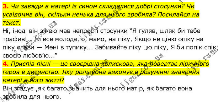 3. Чи завжди в матері із сином складалися добрі стосунки? Чи усвідомив він, скільки ненька для нього зробила? Посилайся на текст. Ні, іноді він з нею мав непрості стосунки “Я гуляв, шляк би тебе трафив!.. Ти все молода, о, мамо, на піку, Якщо не ціню опіку на піку слави — Мені в тупику... Забивайте піку цю піку, Я би попік спік своєю любов’ю...” 4. Приспів пісні — це своєрідна колискова, яка повертає ліричного героя в дитинство. Яку роль вона виконує в розумінні значення матері в його житті? Він згадує ,як багато значить для нього матір, як багато вона зробила для нього.