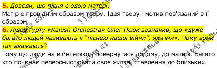 5. Доведи, що пісня є одою матері. Матір є провідним образом твору. Ідея твору і мотив пов'язаний з її образом. 6. Лідер гурту «Kalush Orchestra» Олег Псюк зазначив, що «дуже багато людей називають її “піснею нашої війни”, як гімн». Чому вони так вважають? Тому що люди на війні мріють повернутися додому, до матері. Багато хто починає переосмислювати своє життя, ставлення до близьких.
