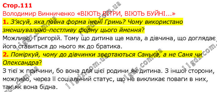 Володимир Винниченко «ВІЮТЬ ВІТРИ, ВІЮТЬ БУЙНІ...» 1. З’ясуй, яка повна форма імені Гринь? Чому використано зменшувально-пестливу форму цього ймення? Можливо, Григорій. Тому що дитина ще мала, а дівчина, що доглядає його ставиться до нього як до братика. 2. Поміркуй, чому до дівчинки звертаються Санька, а не Саня чи Олександра? З тієї ж причини, бо вона для цієї родини як дитина. З іншої сторони, можливо, через її соціальний статус, що не викликає поваги в них, так як вона бідна.