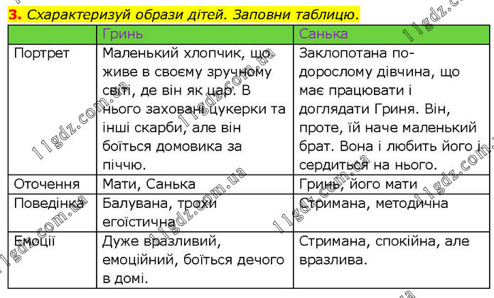 Схарактеризуй образи дітей. Заповни таблицю. Гринь Санька Портрет Маленький хлопчик, що живе в своєму зручному світі, де він як цар. В нього заховані цукерки та інші скарби, але він боїться домовика за піччю. Заклопотана по-дорослому дівчина, що має працювати і доглядати Гриня. Він, проте, їй наче маленький брат. Вона і любить його і сердиться на нього. Оточення Мати, Санька Гринь, його мати Поведінка Балувана, трохи егоїстична Стримана, методична Емоції Дуже вразливий, емоційний, боїться дечого в домі. Стримана, спокійна, але вразлива.