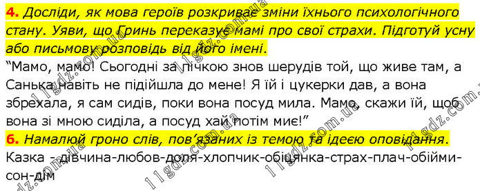 4. Досліди, як мова героїв розкриває зміни їхнього психологічного стану. Уяви, що Гринь переказує мамі про свої страхи. Підготуй усну або письмову розповідь від його імені. “Мамо, мамо! Сьогодні за пічкою знов шерудів той, що живе там, а Санька навіть не підійшла до мене! Я їй і цукерки дав, а вона збрехала, я сам сидів, поки вона посуд мила. Мамо, скажи їй, щоб вона зі мною сиділа, а посуд хай потім миє!” 6. Намалюй гроно слів, пов’язаних із темою та ідеєю оповідання. Казка - дівчина-любов-доля-хлопчик-обіцянка-страх-плач-обійми-сон-дім.
