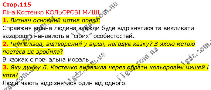 Ліна Костенко КОЛЬОРОВІ МИШІ 1. Визнач основний мотив поезії. Справжня вільна людина завжди буде відрізнятися та викликати заздрощі і ненависть в “сірих” особистостей. 2. Чим епізод, відтворений у вірші, нагадує казку? З якою метою поетеса це зробила? В казках є повчальна мораль 3. Яку думку Л. Костенко виразила через образи кольорових мишей і кота? Люди мають відрізнятися один від одного.